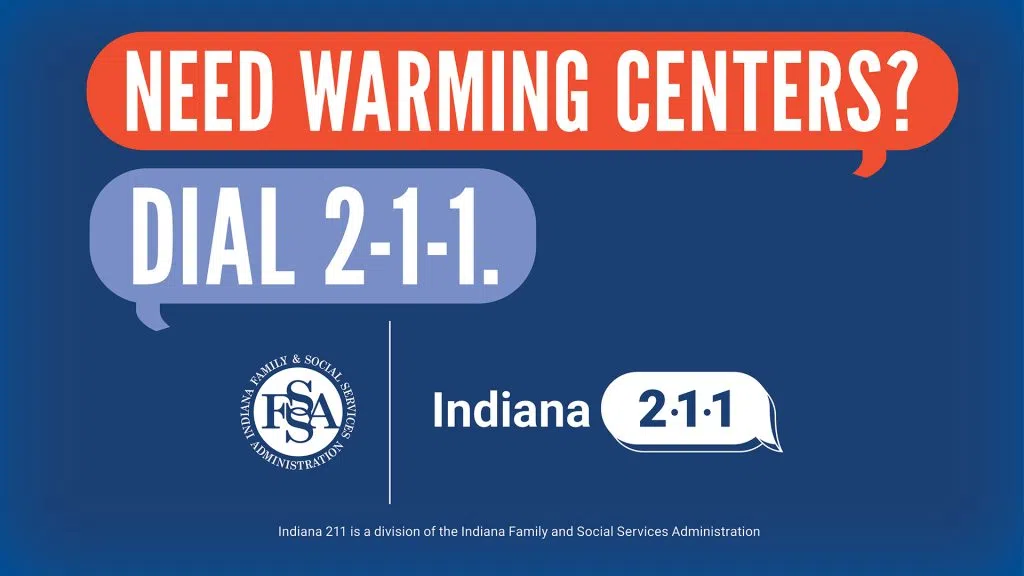 The Indiana Family and Social Services Administration says Indiana residents can call 2-1-1 to find local warming centers during upcoming winter weather. The agency said warming centers will be open across the state for those in need of a safe and warm place to stay as nighttime temperatures are expected to drop to around zero. Indiana 211 provides local community information on warming center locations and hours. Hoosiers can also access a wide range of services through Indiana 211, including: Food assistance programs and local pantries; Warming centers and shelters during cold weather; and, Help with housing, utility support, mental health services, and more. Here is a link for more information – IN211.org .